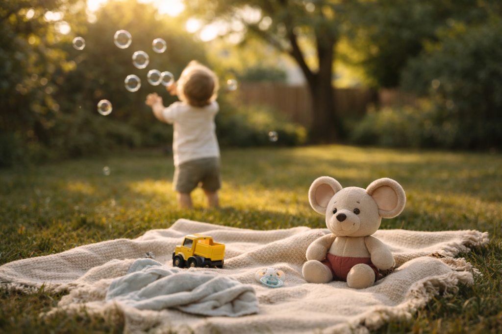 Playing bubbles in the backyard with my niece the other day — just like I did with big brother. Watching her love being outside the same way he did. Finding a Mickey Mouse plush that looks almost identical to the one I sent with him — the one he slept with at night.
